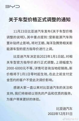 事实上,2022年新能源汽车市场普遍出现涨价潮,不只是比亚迪,多家新能源车企都进行了多轮价格上调,合过来,今年购买新能源车基本上也就是回到2021年的价格水平。