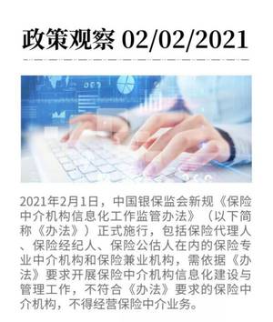 2020年以来,银保监会不断加强对保险中介市场的规范管理,首次提出推动构建新型保险中介市场体系,保险中介机构信息化建设与管理任务再次被提上日程。2021年1月12日,银保监会发布《保险中介机构信息化工作监管办法》,对保险中介机构信息化建设与管理工作提出全面要求,明确指出不符合《办法》要求的保险中介机构,不得经营保险中介业务。