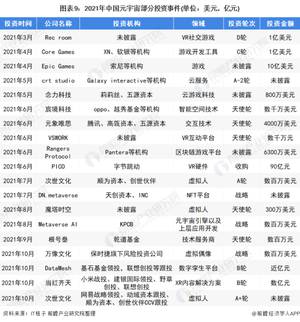 2021年我国元宇宙相关领域投资事件频发。相关领域包括VR、区块链、云服务、虚拟人、NFT等。除专业投资机构外,投资企业所处行业大多集中在电子信息和游戏领域,代表企业有腾讯、莉莉丝等。从投资轮次来看,大多集中在天使轮,说明大部分项目仍处于起步阶段,但投资金额保持在较高水平。具体投资事件如下: