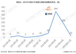 自2021年3月起,国内企业开始注册元宇宙相关商标。2021年7月之前我国元宇宙相关商标注册量保持在25项以下,2021年8月申请量首次突破50项。2021年9月,随着阿里巴巴、中青宝等公司入局,元宇宙商标申请量达到峰值,为344项。2021年10月申请量有所放缓但仍保持在较高水平。而在2021年11月,仅8天就有22项元宇宙相关商标提出申请。