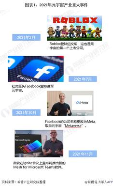 从2021年元宇宙第一股于纽交所上市以来,各大企业在元宇宙领域的布局出现在了科技圈和大众视野中。2021年7月,Facebook宣布进军元宇宙。2021年10月28日,Facebook创始人扎克伯格表示将Facebook的公司名称更改为Meta,并将Facebook的同名服务降级为该公司的子公司之一,与Instagram和WhatsApp并列,而不是总体品牌。随后2021年11月,微软在Ignite会议上宣布将推出新的Mesh for Microsoft Teams软件,待该平台上线后,不同地理位置的人可获得协作和共享全息体验,实现加入虚拟会议、发送聊天、协作处理共享文档等更多功能。2021年全球元宇宙产业代表性事件如下: