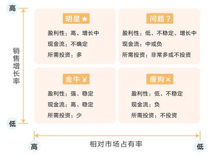 本法将企业所有产品从销售增长率和市场占有率角度进行再组合。在坐标图上,纵轴表示企业销售增长率,横轴表示市场占有率,各以10%和20%作为区分高、低的中点,将坐标图划分为四个象限,依次为“明星类产品(★)”、“问题类产品(?)”、金牛类产品(¥)”、“瘦狗类产品(×)”。其目的在于通过产品所处不同象限的划分,使企业采取不同决策,以保证其不断地淘汰无发展前景的产品,保持“问号”、“明星”、“金牛”产品的合理组合,实现产品及资源分配结构的良性循环。波士顿矩阵对于企业产品所处的4个象限具有不同的定义和相应的战略对策。