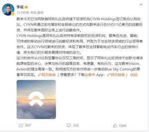 6月20日,蔚来宣布,已与阿联酋阿布扎比政府旗下投资机构CYVN Holdings签订股份认购协议。CYVN Holdings将通过定向增发和老股转让的方式进行总计约11亿美元的战略投资,未来还将在蔚来国际业务上进行战略合作。