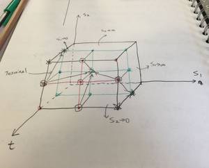 而PDE方法的缺点主要有两点:路径依赖问题,高维度问题。很多路径依赖问题的PDE形式是很麻烦,甚至无法表达的,比如亚氏期权,比如回望期权。而对于高维度问题,如果PDE的数值方法会从平面网格上升到空间网格,在复杂度上不但繁琐,而且在边值条件上更难以控制。而PDE的优点则是速度快,而且根据差分的数值方法,在计算Greeks的时候不需要加以再次的bumping计算。举个例子,如果不降维,一个具有两个assets的期权的有限差分就是这样的一个立方网格: