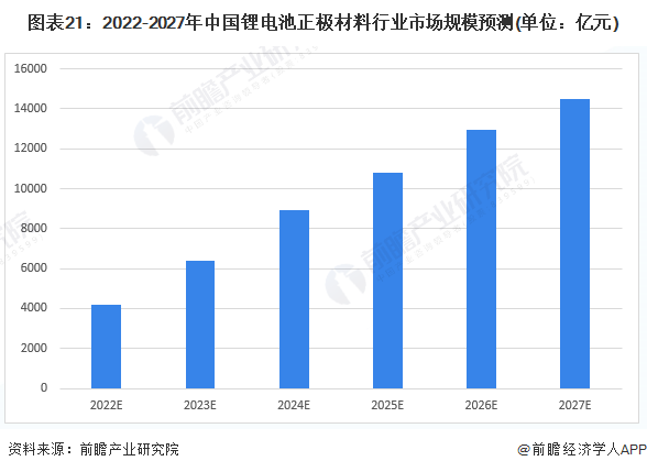 综合锂电池正极材料未来在动力电池、消费电池、储能电池三个方面应用情况,前瞻初步预测到2027年,锂电池正极材料市场规模将达到14470亿元。