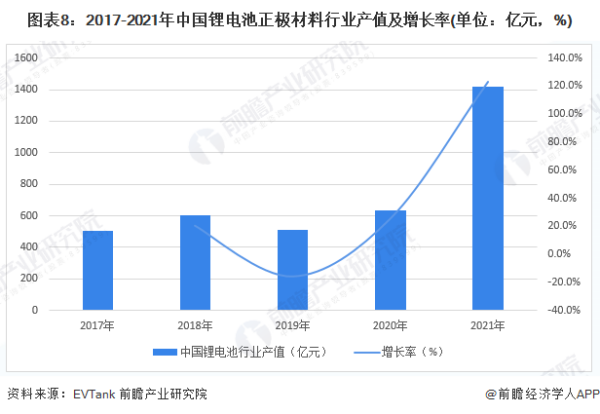 根据EVTank的数据,2017-2021年,中国锂电池正极材料行业产值处于增长的状态。2021年中国锂电池正极材料产值为1419.1亿元,同比增长123.1%。