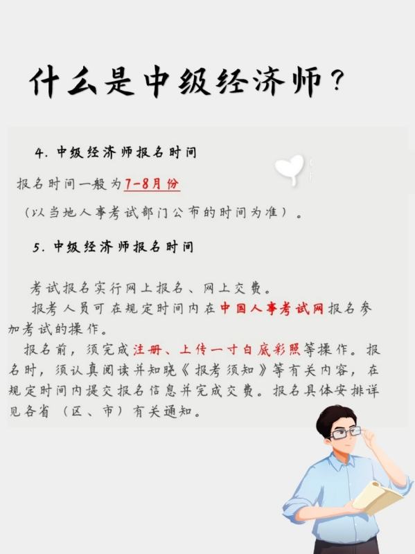 4.中级经济师报名时间报名时间一般为7-8月份(以当地人事考试部门公布的时间为准)。
