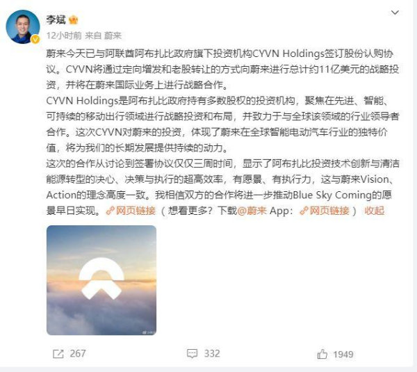 6月20日,蔚来宣布,已与阿联酋阿布扎比政府旗下投资机构CYVN Holdings签订股份认购协议。CYVN Holdings将通过定向增发和老股转让的方式进行总计约11亿美元的战略投资,未来还将在蔚来国际业务上进行战略合作。