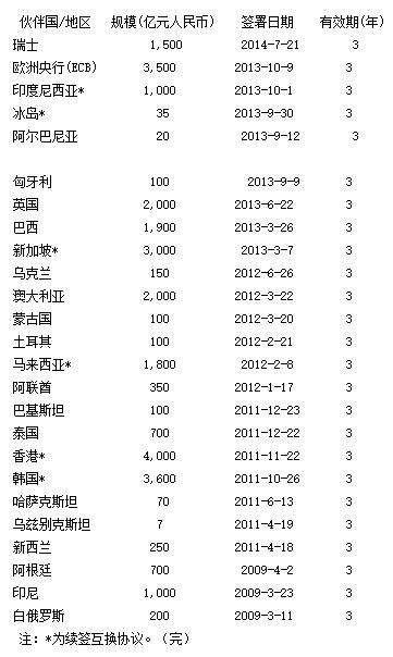 2014年10月11日,中国人民银行与韩国中央银行续签了规模为3600亿元人民币/64万亿韩元的中韩双边本币互换协议。