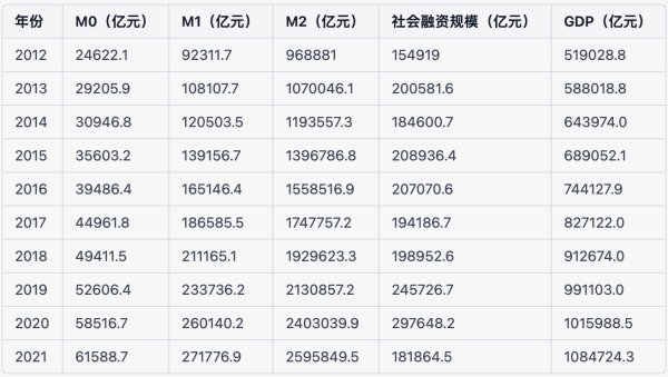 根据央行网站的数据,以下是我国近10年(2012年至2021年)的M0、M1、M2、社会融资规模和GDP数据: