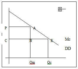假定长期平均成本对于厂商和行业都不变,并通过直线Mc=Ac来表示。完全竞争条件下的产出将为Qc,在这位置上,Mc与需求曲线DD相交。如果卖方是一个垄断者,他可以生产Qm按价格P售出而获得最大利润。他的垄断利润不可用矩形ABCP表示。消费者盈余的损失则以梯形AECP计量。但是,ABCP表示的这个区域并非损失的福利,而只是财富从消费者转移到垄断者。社会整体由于垄断的净损失为“福利三角形”ABE,在图1中用字母W来表示。哈伯格作出一些很大的假定,特别是假定所有产业的边际成本(Mc¬)都不变,需求的价格弹性处处都等于1,然后估计美国制造业部门在20世纪20年代的年福利损失为5900万美元。这个数字出奇地小,因为它只占那一时期美国国民收入的千分之一。