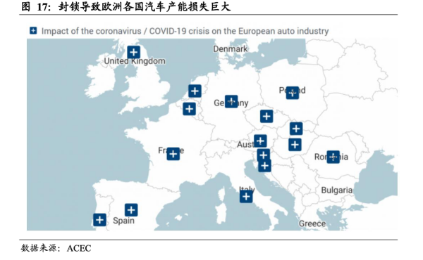 根据欧洲汽车协会(ACEA)的截至4月9日的统计,由于封锁所导致的欧洲汽车产能损失已经达到了150万辆。目前欧洲汽车行业整体的开工率仅相当于实际产能的60%到65%。