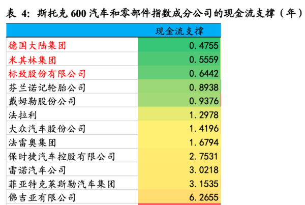 进一步以斯托克600中汽车和零部件相关公司作为分析,该指数中有13个标的,可以作为资质较好的公司的代表。我们利用现金和现金等价物作为企业目前的现金储备,用营业开支(operatingexpense)减折旧与摊销作为企业在停产情况下仍然需要进行的支付的开支的代表。二者相除作为企业可以在接近停产的情况下可以支撑的时间。则13家公司中,有5家公司难以支撑1年,2家公司支撑不足半年。