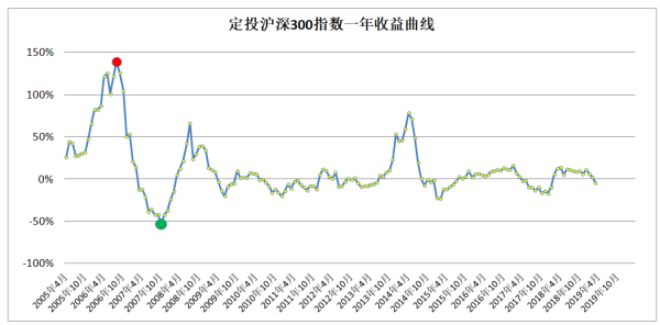 由此可见,在不同的时间点入场进行定投,最终的结局可能千差万别。就如本例而言,有可能获得正收益138.9%,也有可能品尝亏损的苦酒折损一半以上。
