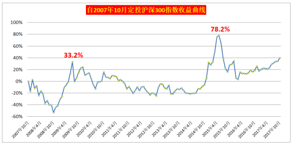 在以上定投最惨的情况下,自2007年10月开始按月定投沪深300指数,可能在2008年9月时亏损超过50%。但是,如果投资者能够持之以恒继续按月定投下去,则会沿着下述收益曲线奇迹般地扭亏为盈,在2009年7月时录得正收益33.2%。甚至完全丧失人性,如果投资者有超越常人的耐心,一直坚持定投到2015年4~5月的话,可以获得投资正收益78%左右。
