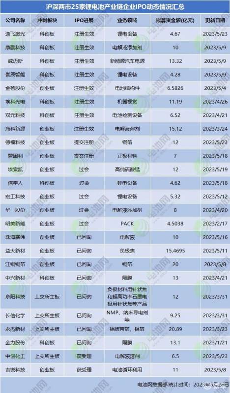 值得一提的是,统计在内的25家IPO在途并更新动态的电池新能源产业链企业中,有10家已至提交注册阶段,其中8家注册已生效,只待发行上市;有5家通过上市委会议;8家状态已问询;两家状态获受理。
