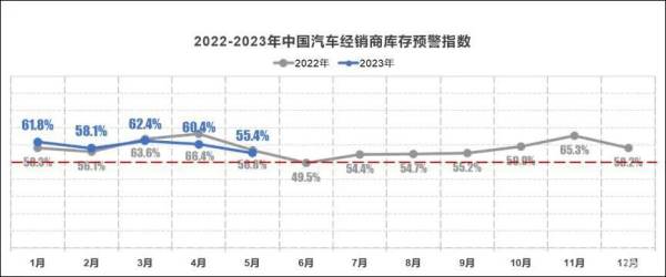 据中国汽车流通协会发布的最新一期“中国汽车经销商库存预警指数调查”VIA(Vehicle Inventory Alert Index)显示,2023年5月中国汽车经销商库存预警指数为55.4%,同比下降1.4个百分点,环比下降5.0个百分点,库存预警指数位于荣枯线之上,汽车流通行业景气度有所好转。
