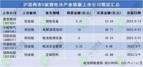 近日,电池网对2023年以来正在奔赴上市的产业链企业动态进行了梳理。从结果来看,2023年以来,沪深两市电池新能源产业链企业共有32家更新IPO动态,科创板和创业板均16家。其中,包括曼恩斯特、中船特气、日联科技、华塑科技、湖南裕能等5家企业已于2023年成功上市,其余27家公司中,25家IPO在途,华慧能源、惠强新材两家年内撤回上市申请,IPO终止。