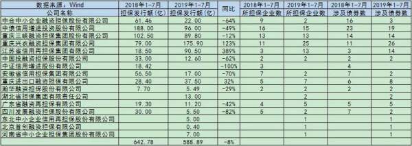 笔者对比分析了部分融资担保公司2018和2019前7月的新增担保债券数据,除了两家担保公司同比有较大增长,其他都有不同程度的下滑,尤其在典型融资担保公司里提到的几家同比下滑幅度较大,减幅平均超过50%,在加总数据上2019年前7月也有同比8%的下滑幅度。这似乎在一定程度上表明了6号文执行近半年以来的政策效果,而我们可据此大胆推测:对于依赖担保机构增信才能发债和融资的低资质、区县级城投平台,AA尤其是AA-及以下评级债券,随着政策性担保增信支持受到抑制,这些平台的后续再融资将面临一定困境,再融资难度上升是否会对城投信仰产生冲击?