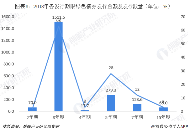 2018年,绿色债券的发行期限主要为3年期,5年期次之。2018年,我国发行的111只普通贴标绿色债券中共发行3年期绿色债券63支,占比56.76%,发行5年期绿色债券28支,占比25.23%。2018年我国绿色债券市场上未发行短期融资券,15年期的长期债券共发行了3支。