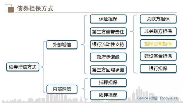 债券增信可以分为内部增信和外部增信。内部增信指信用增强来源于企业内部,债券市场上常见的方式有资产抵押担保和资产质押担保,两者都属于物保。外部增信方式通常有一般保证担保、第三方连带责任、银行流动性支持、政府承诺函及第三方回购承诺等。国内债券市场的外部增信方式目前第三方连带责任的方式运用最多,为企业提供外部增信的第三方包括关联及非关联企业、专业担保公司、建设基金和银行担保等。