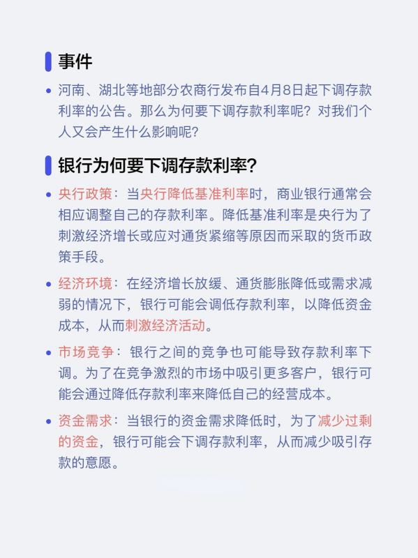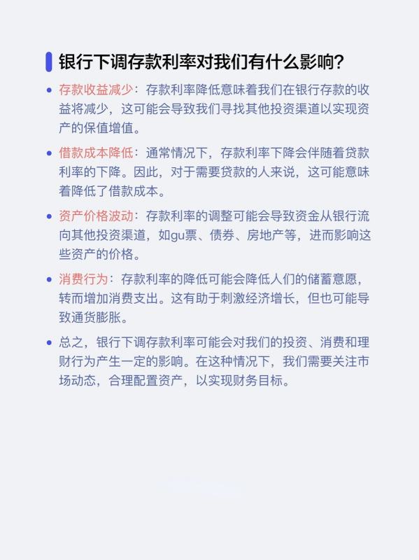 对我们来说,银行下调存款利率可能会产生以下影响: