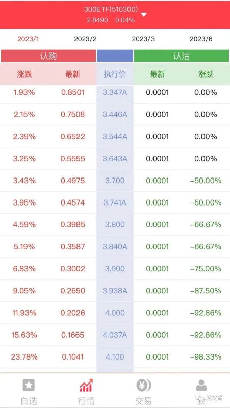 沪深300ETF期权T型报价界面,左边为认购看涨,右边为认沽看跌。