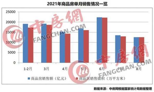 根据2021年以来的国家统计局数据分拆后测算,8月份商品房销售面积达12545万平方米,环比下降3.6%%。商品房销售额为12617亿元,环比下降6.53%。从同比情况来看,8月份商品房销售面积和销售额相比2020年同期分别下降了15.55和18.71%。
