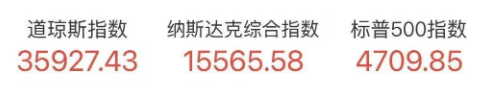 周三收盘,道指上涨383.25点,涨幅为1.08%,报35927.43点;纳指涨327.94点,涨幅为2.15%,报15565.58点;标普500指数涨75.76点,涨幅为1.63%,报4709.85点。