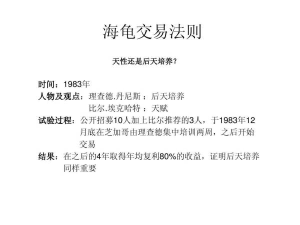 主要讲述的是海龟所用的交易系统是一个完整的交易系统。这是我们取得成功的一个主要因素。我们的系统使我们更容易地进行一致性的、成功的交易,因为它没有给交易员的判断力留下重要的决策任务。