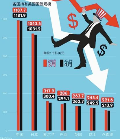 数据显示,4月,中国所持的美国国债总规模降至1.1819万亿美元,日本所持的美国国债总规模降至1.0312万亿美元,英国所持的美国国债总规模降至0.2627万亿美元。爱尔兰所持的美国国债总规模降至0.3004万亿美元,瑞士所持的美国国债总规模降至0.2422万亿美元,卢森堡所持的美国国债总规模降至0.2139万亿美元。