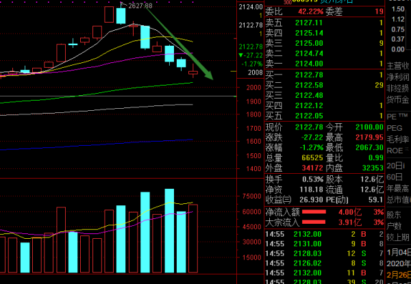 2月18日贵州茅台出现高开低走,当天冲到最高价为2627.88元,当日最高市值已经达到约3.27万亿元。