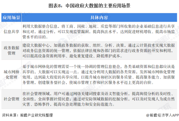 中国政府大数据主要应用于信息共享、政务数据管理、城市网络管理与社会管理几大领域。加强电子政务建设,管理好政府的数据资产,完善政府决策流程,将是未来数年大数据在公共管理领域发展的重要方向。大数据将对政府部门的精细化管理和科学决策发挥重要作用,从而提高政府的服务水平。舆情监测、交通安防、医疗服务等将是公共管理领域重点应用领域。