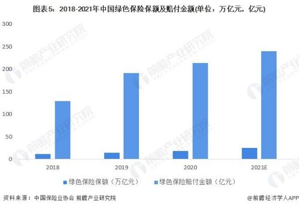 我国绿色保险近年来得到了快速的发展和提升。根据中国保险业协会数据,2018年至2020年我国绿色保险保额与赔付金额持续增长,2020年我国绿色保险保额达到18.33万亿元,同比增长24.9%,绿色保险赔付金额213.57亿元,同比增长11.6%。初步估计2021年绿色保险保额超过25万亿元,赔付金额达到240亿元。