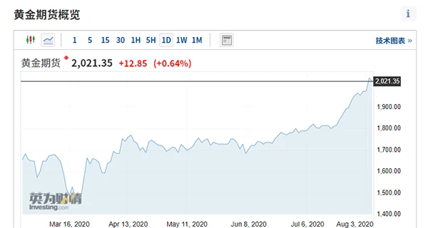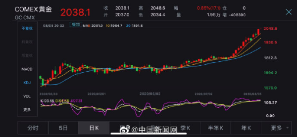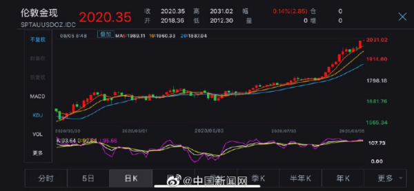 黄金价格史上首次超过了2000美元。 当地时间8月4日,伦敦黄金现货和COMEX黄金期货价格历史上首次突破2000美元/盎司,创造了新纪录。 截至8月4日,2020年以来,伦敦实物金额上涨32.98%,纽约商品交易所期货金额上涨34.02%。 亚洲时间8月5日,到原稿发行时为止,伦敦的黄金现货价格持续上升到2031.02美元/盎司,纽约商品交易所的黄金期货最高报为每盎司2048.6美元。