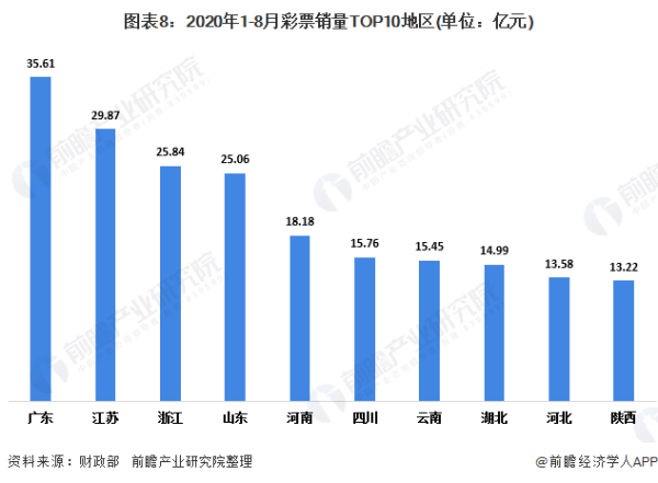 广东省是目前全国彩票销量最高的省份,2020年1-8月,广东省彩票总销量为35.61亿元,同比增长8.7%。销量排在第二和第三位的是江苏省和浙江省。
