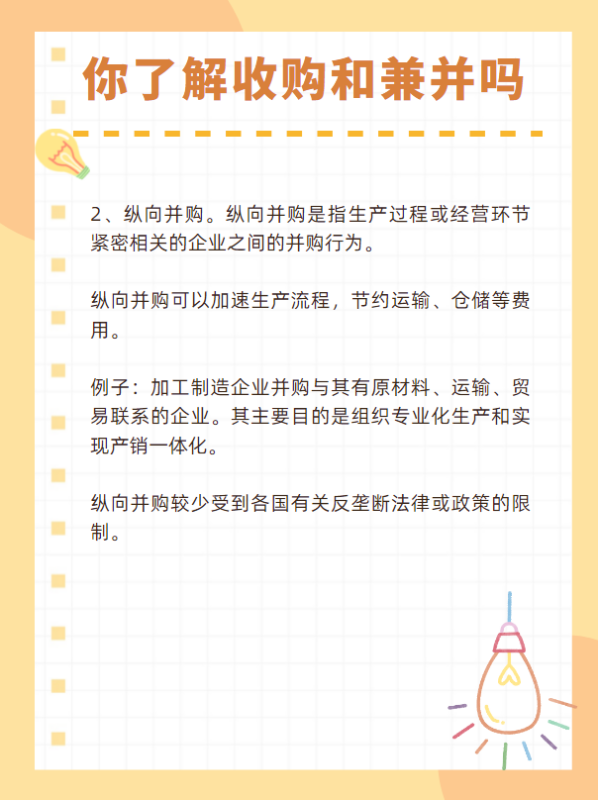 2、纵向并购。纵向并购是指生产过程或经营环节紧密相关的企业之间的并购行为。