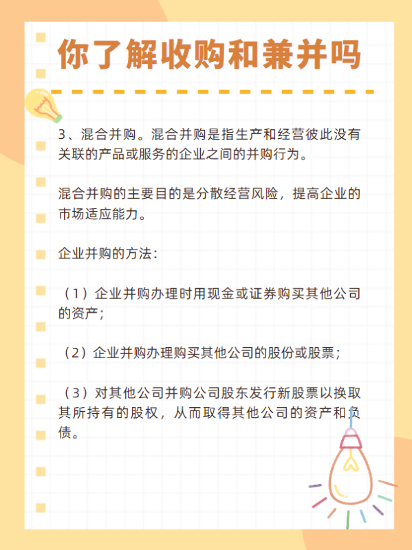 3、混合并购。混合并购是指生产和经营彼此没有关联的产品或服务的企业之间的并购行为。