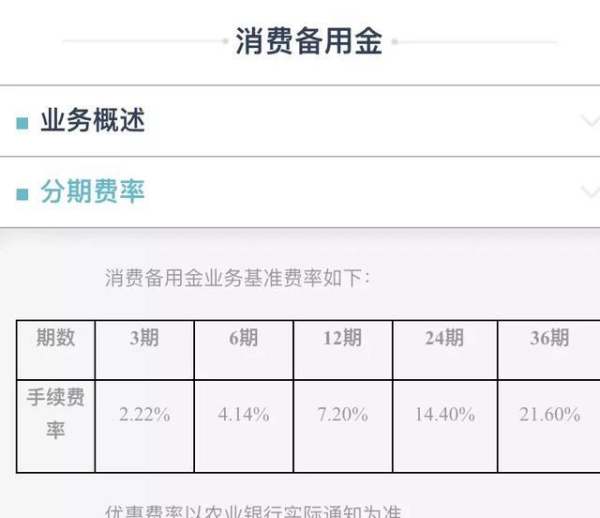 2、利率和期限,目前农行备用金分期手续费2.22%到21.6%不等,期限分为3、6、12、24、36几种。