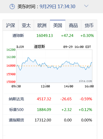 美东时间9月29日11:55(北京时间9月29日23:55),道琼斯(16049.13, 47.24, 0.30%)工业平均指数上涨42.76点,报16,044.65点,涨幅为0.27%;标准普尔500指数上涨9.25点,报1,891.02点,涨幅为0.49%;纳斯达克(4517.32, -26.65, -0.59%)综合指数上涨26.70点,报4,570.67点,涨幅为0.59%。