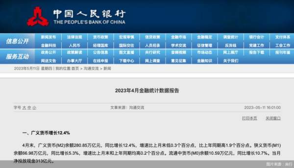 4月居民人民币贷款、存款双双回落,也对货币供应产生了影响。根据央行披露的数据,4月末,广义货币(M2)余额280.85万亿元,同比增长12.4%,增速比上月末低0.3个百分点,比上年同期高1.9个百分点。狭义货币(M1)余额66.98万亿元,同比增长5.3%,增速比上月末和上年同期均高0.2个百分点。流通中货币(M0)余额10.59万亿元,同比增长10.7%。当月净投放现金313亿元。