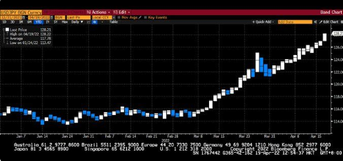 在周二亚洲时段,日元进一步大幅走弱,目前美元兑日元已经升破了128关口,创下近20年高位128.22。