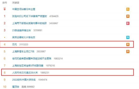 截止北京时间周二13点,有关“日元”和“人民币兑日元逼近20大关”的话题标签已经双双登上了微博热搜的前十位。