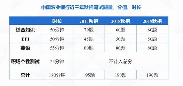 农业银行招聘考试考英语、综合素质、通用就业素质测评(EPI)、性格测评,其中性格测试是不计入笔试总分成绩。综合素质考经济、金融、会计、管理等学科,EPI包括言语理解、逻辑推理、资料分析、数字运算、思维策略。