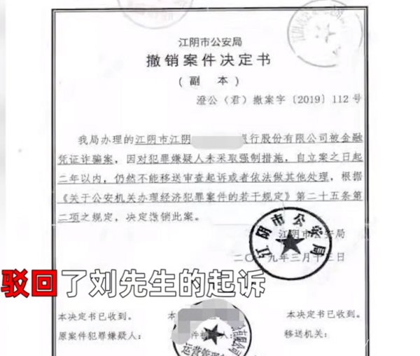 目前的情况就是,刘先生妻子的“金融凭证诈骗案”已被警方撤案,当然这不代表存单就一定是真的,只能说明刘先生和其妻子没有伪造金融凭证的嫌疑。而刘先生也再次向无锡市检察院提起抗诉申请,无锡市检察院已受理。