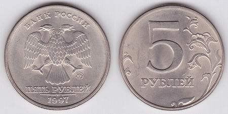 这是俄罗斯发行1997年的5卢布流通硬币,“рублей”是俄语“卢布”的意思。俄罗斯卢布是俄罗斯的本位货币单位。辅币是戈比(Копейка)。1卢布=100戈比。硬币背面上方的文字“BAHKPOCCИИ”是俄语“俄罗斯银行”的意思,下方的文字“пятьрублей”是俄语“五卢布”的意思,双头鹰是俄罗斯的国徽图案。 5卢布硬币现在还在流通中,邮币市场上单枚价格在5元左右。