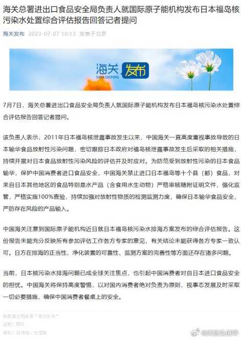针对日本政府这一不负责任的行为,2023年7月7日,中国海关总署最新发布,为防范受到放射性污染的日本食品输华,中国海关禁止进口日本福岛等十个县(都)食品,对来自日本其他地区的食品特别是水产品(含食用水生动物)严格审核随附证明文件,严格实施100%查验,持续加强对放射性物质的检测监测力度,确保日本输华食品安全。