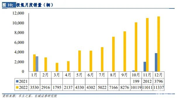 以极氪001为例,2022年累计交付约7.2万辆,平均订单金额超33.6万元,持续蝉联30万元以上中国品牌纯电车型销量冠军。截至2023年1月31日,极氪累计交付突破8万辆。车型单月交付破万,BBA用了10年,特斯拉9年,极氪001仅用一年。