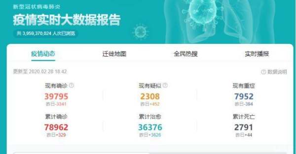 截至2月28日9时,全国累计报告确诊病例78959例,累计死亡病例2791例,累计治愈出院36157例,现有疑似病例2308例。