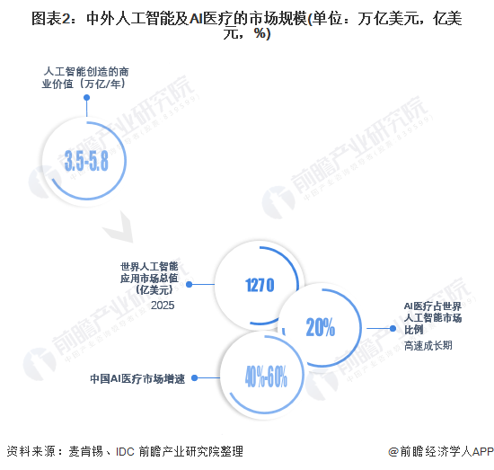 麦肯锡咨询的数据表明,人工智能每年能创造3.5万亿至5.8万亿美元的商业价值。根据IDC数据,预计到2025年全球人工智能应用市场总值将达1270亿美元,其中全球AI医疗处于高速成长期,占人工智能市场五分之一。我国人工智能产业发展快速,自2018年AI应用于基因测序以来,AI医疗的商业化模型逐步形成,2019年后,AI医疗以40%~60%的增速快速发展,如今中国AI医疗核心软件市场规模接近30亿元,加上带有重资产性质的AI医疗机器人,总体规模接近60亿元。